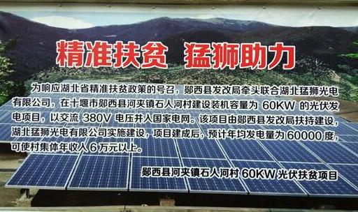 自去年5月以来,猛狮科技为郧西县境内18个乡镇的98个重点扶贫村集体建设光伏电站,规模总计5.85MW,已于今年6月30日前全部并入国家电网,预计每年发电588万度,年创收600万元以上。