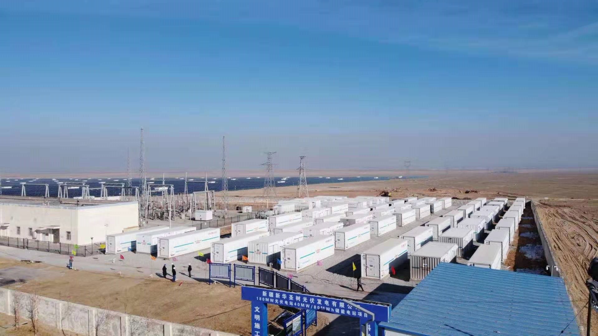 猛狮科技-新华圣树光伏储能联合运营项目位于新疆和田市墨玉县,电站采用磷酸铁锂电池系统,共用61个储能集装箱,通过两回相互独立35KV集电线路汇接入新华圣树光伏电站110KV升压站35KV母线。项目从2019年10月开工建设,项目组克服天气、运输、建设等方面的重重困难,历时短短62天完成了项目施工建设、设备集成交付、调试并网等一系列工作。该储能项目并网投运后,可起到平滑光伏电站出力、调峰移荷、增加光伏发电小时、提高供电可靠性等作用,为和田地区供电、冬季采暖等提供保障。