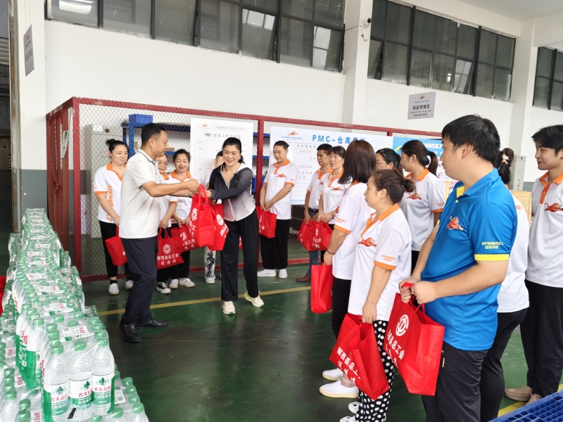 赵立平主席一行领导对奋战当“夏”、不畏酷暑、抢抓生产的十堰猛狮一线职工们表示慰问和敬意,并送上了实用的生活物资、防暑、解暑饮品等“清凉”礼包。为坚守在生产一线的职工送去了丝丝凉意和浓浓关怀。